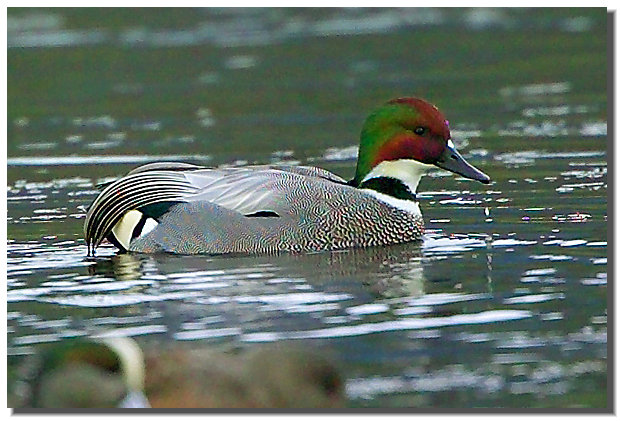 This duck, possibly the only wild Falcated Duck in North America, is living a charmed existence. It has returned to the same small pond just off I-5 in Eugene for the fourth winter. It has been seen by thousands of birders adding to their "life lists", flying in from everywhere in N.A. and possibly beyond. The following 6 pictures shows the duck in Dec, 2006. It is aging, has a much shorter bustle of "falcated" feathers, and its bronze head color is no longer so vibrant