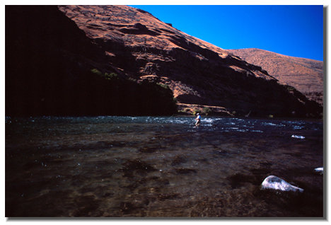 | A knowledgeable Deschutes afficionado will recognize this as likely the lower canyon below Maupin, with it's more eroded and rounded hills. Above Maupin it is more rimrock and vertical basalt faces. | ||||||||||||||