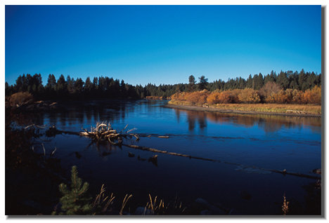 | There are many Deschutes Rivers, from the mountain stream running through ponderosa and jackpine above Crane Prairie and Wikiup lakes, the mostly meandering meadow stream from the lakes to Bend, and that crashing, brawling thing below Pelton Dam. This and the following pictures are in the Sunriver section | |||||||||||||||