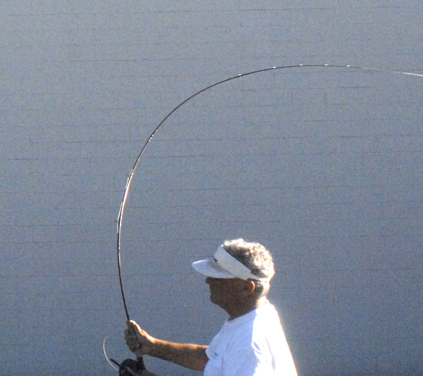 This pictures shows a real life cast with a 9’ 8 wt rod loaded with 300 total grains of a head, leader, and fly. The most dramatic thing in this picture is the flexion in the rod. The 9 foot stick has been flexed into an approximately 66 inch tall, stable-shaped device through which, by (necessarily) constant application of force that (necessarily) constant 300 grains of weight is going to get up to 85% of it’s acceleration.