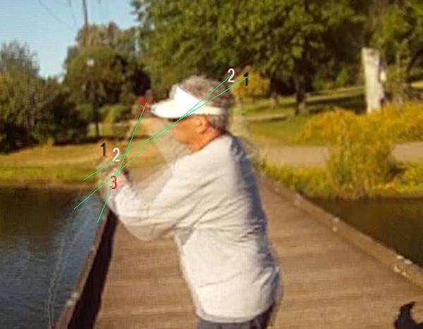 IF friction were infinite what are the directions (as vectors) I am pulling on the rod? THAT depends on the position of the line hand with respect to the line of rotation created by a line running down the rod from the guide through the rod hand pivot point. We can only demonstrate in 2 planes. I will draw the pivot line and look for the position of my line hand. See figure 12: