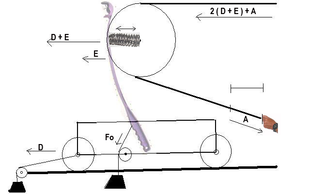In terms of defining line speed, the rod hand is advancing (D). The rod/lever is rotating forward (force Fo) creating a tip-of-lever speed E…so the basic UN-hauled line speed will be D + E. ON TOP of that will be added the haul component, which is the D + E speed moving away from the hand ( 2(D + E)) AND the hand speed pulling actively backward (A).