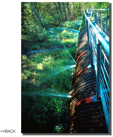 The concept is simple: rather than build a high dam, just divert water far upstream and run it downriver in an enclosed conduit and then generate power out of the high pressure flow down at the bottom. This is the last remaining section of the old, original wooden slat and hoop pipeline, about 150 yards of it. The rest has been replaced with modern steel conduit. The wood is deteriorating and it is leaking like a sieve. Actually they have recently plugged some of the bigger leaks. Last year there was one hole blowing out a flume 100 feet laterally.
