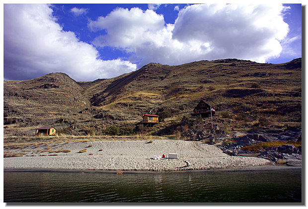 The Z & S Outfitters lodge on the right, bunkhouse in the middle, and Mike and Gail's cabin down on the left. There is a hot springs fed "hot tub" dug out just below the rocks.