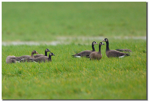 | Note the partial white cheek of a Canada/Cackler, the dark breast of a Cackler, the white bill rim and partial orange beak of a Whitefront. Can't see the legs. Again, probably a family unit which stays together through the first winter until they return to the breeding grounds in the spring. | |||||||||||||||||