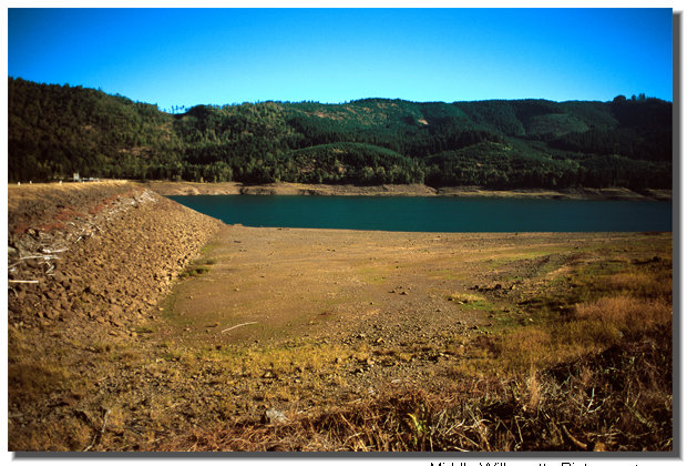 | Lookout Point Dam at low end-of-summer pool. That is 150 feet of vertical pool loss. After several drought years, it is even lower than usual. | |||||||||||||||||