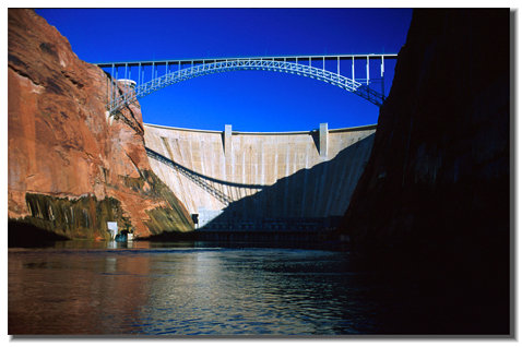 | Glen Canyon Dam, which is solely responsible for the clear, cold water and the resulting fishery. Behind the dam is Lake Powell which backs up nearly 200 miles and has flooded Glen Canyon and many other natural wonders (forever,??) By a slight miscalculation, the water backed up into the sandstone in this climate has resulted in a loss of 30% of the river flow to evaporation. Oops! | ||||||||||||||