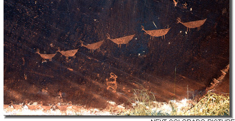 We were kicked back in the sled eating lunch at a place we had nicknamed "frustration bar" for the difficult fish when a huge double pontoon people barge pulled up and landed next to us. The Ranger stood up and said to the 15 tourists, "You can use the rest rooms on the hill up the path and then we will assemble at the base of the cliff to discuss the pictograph wall here, the biggest and best one in the canyon". We looked at one another, sandwiches went flying, and we joined the group. It was spectacular. The black patina on the sandstone takes 2000 years to develop, so rock events can be roughly dated by it's development. The river, as the only reliable source of water in a vast desert, was the center of most biological life, and most if it compressed in the narrow strip of flattish land between the water and the cliffs. In the pre-dam river, all potential archeological accumulations were washed away with the yearly spring floods. The pictographs, 2000+ years old, are all that remain. Here, Pronghorn antelope (forward facing horns, as opposed to bighorn sheep) descend to the watrer, and a small seated figure works at an un- certain chore. |