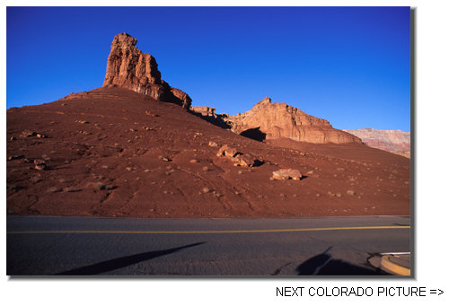| The access road (and my shadow again). Everything is defined by the strength of the substrate. Where it is soft it is eroded, crumbling and flattening. Where it is solid it is vertical. The soft clay here is exactly why there is a break in the canyon wall that allows the easy gradient road in to the water at Lee's Ferry site. | |||||||||||||