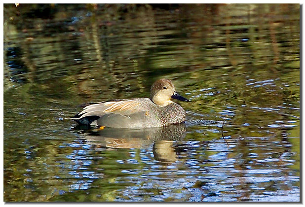 Compare the elongated tertiary wing feathers in this and the next photo with the Falcated "Teal" pictures. The Falcated Duck is most closely related to the Gadwall