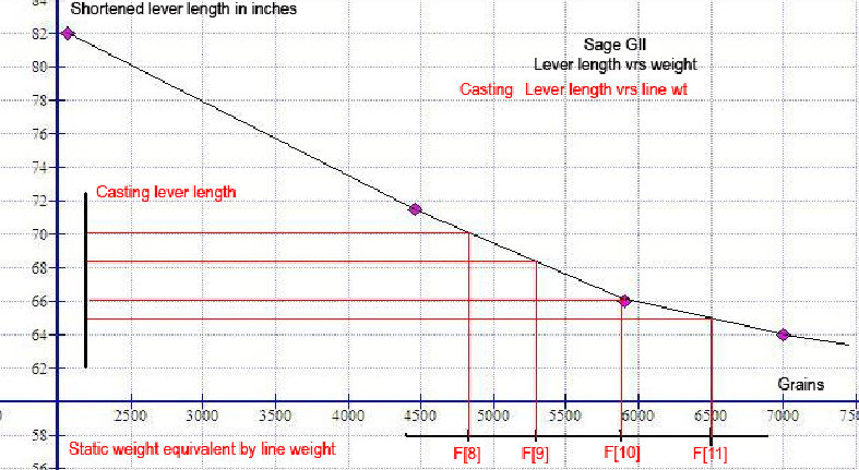 Assume for the moment that one can correlate the static weight with the Dynamic Force which causes equal flexion, static and dynamic. Superimposed is the Force line of which I have one rough point...the others are conceptualized and the scale of the Force line might be more squashed or strung out. Taken in it's entirety this would represent a predicted flexion for this rod for every line weight or load.