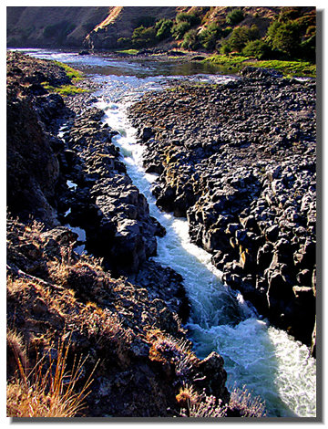 The Slot. This is the first, and last major, barrier to salmon and steelhead in reaching the whole of the John Day River above. In higher flows the secondary slot (now dry) on the left is probably the favored fish route. One can watch fish jumping here during the run.