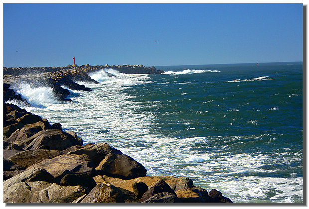 On February 2, 2005. Air temp 55 degrees. One of the best kept secrets is that the weather on the Oregon Coast in Winter is sometimes awful and often wonderful. Note fisherman on the Jetty.