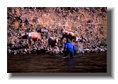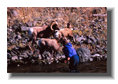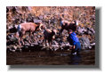 And then there is Sue Bussard scratching with Bighorns. Bighorn sheep are a common enough site on the Snake. They have been re-introduced and are carefully monitored and managed by the biologists. They generally ignore sleds but are wary of people who look like the biologists who net them and dart them (notice the radio collar on the ewes). We were pulling in to pick Sue off a run when Mike noticed the three sheep coming down to the water downstream from Sue. "In 30 years on the river I've never seen anything like this", he said. I put on a telephoto and started shooting, not knowing when the sheep would notice Sue and spook or shy from the boat. As I ran through a roll, amazingly the sheep moved upriver right behind Sue, who didn't know what to do or whether she might become a target of the ram who was rutty. We idled closer and I kept shooting. These are the result.