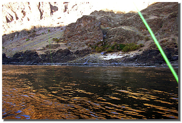 Swinging the fly through a run. Classic steelhead water, especially on the Snake. A quiet slow hole grading up into shallowing and faster flow of the tail out. Note the quietinside water on the right and the near shore riffles showing on the left. I got two fish here.