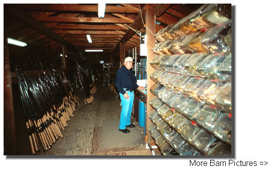 | Glenn in the upstairs salesroom where the finished rods are displayed. The whole rest of the barn is given up to storage for the blanks, 50,000 of them!! | |||||||||||||||